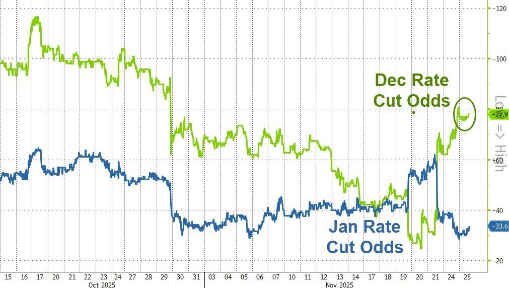 In commodities, oil fell sharply after ABC News reported that Ukraine agreed with the US on the terms of a potential peace deal with Russia, with only some minor detail to be sorted out, although subsequent reports from WaPo indicated that Russia will once again balk on the proposed deal. Spot gold is flat near $4,134/oz. Bitcoin falls 2% to near $87,000.