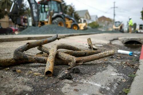 Old rusty utility pipes sit on the ground where workers with East Bay Municipal Utility District are installing a new water pipe in Oakland, Calif., on April 22, 2021. Leaky pipes take on a whole new dimension when toxic sludge enters rivers and other water resources. Justin Sullivan/Getty Images