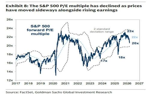As we noted last night, Goldman predicts that the AI investment boom should offset the drag from modestly weaker economic activity for corporate earnings in the US, reiterating a forecast for 12% EPS growth for the S&P 500 in 2026. Global equities are at risk of a correction, though probably not a bear market, according to other strategists at the bank. On the other hand if the oil crunch extends, the S&P could drop as low as 5,400 in a worst case scenario according to Goldman.