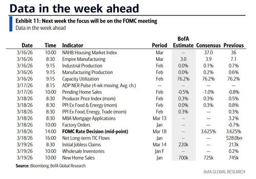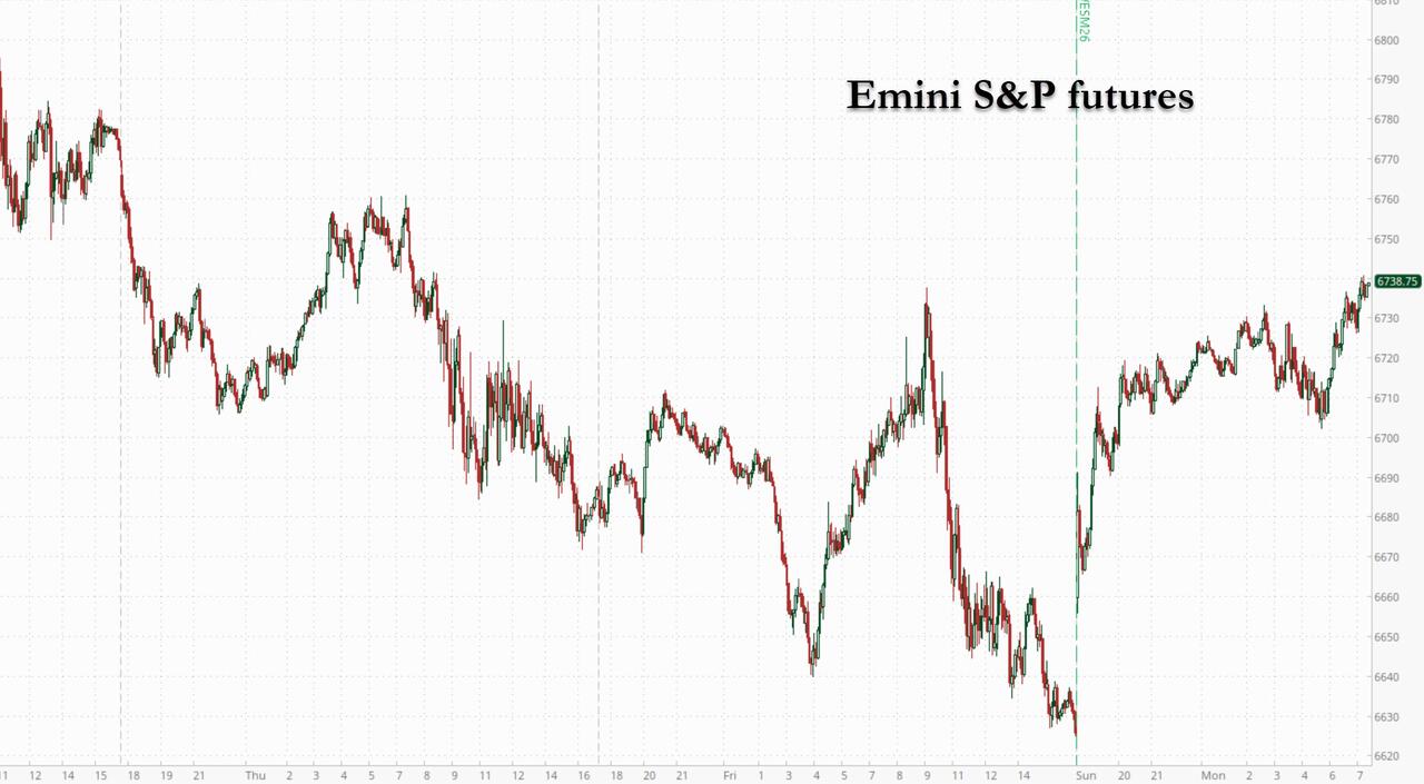 Stock futures are higher AS energy prices dip modestly even as the war in the Middle East enters a third week, with Trump’s endgame unclear amid requests for international help to reopen the SoH. As of 8:00am ET, S&P futures are up 0.8% and and Nasdaq futures gain 1.0% with all Mag 7 names higher in premarket trading led by Meta which is reportedly planning layoffs that could affect 20% or more of the company. The bounce in futs and the slide in oil coincided with comments from the Iranian Foreign Minister that the US has already learned a good lesson. However, he did also note that the nation is not requesting a ceasefire and has not messaged the US. Cyclicals outperform Defensives in what appears to be a relief rally. As JPM writes this morning, "it is unclear if futures are following the recent trend of a higher Monday into a sell off for the balance of the week, or if the market is pricing a pivot despite the likelihood that oil production curtailments will approximately double this week." Bond yields are lower by 1-2bp as the curve bull steepens, and USD is lower. Commodities are weaker ex-Energy. Initially oil jumped at the start of futures trading on Sunday night following a second attack in three days on Fujairah, a vital port in the UAE that’s just outside the Strait of Hormuz, but has since turned red. And while shipping through the Strait has been all but halted since the war started, several Iranian tankers as well as a vessel controlled by have made the journey. Today’s macro data focus is on Industrial Production, home prices, and regional activity indicators. The Fed meeting (plus other major CBs) and PPI are the other major releases this week.