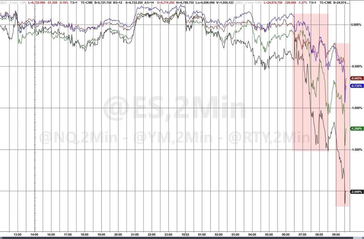 US equity futures are flat again, with tech and small caps lagging as traders parsed the latest earnings reports and corporate news amid worries over trade, the US government shutdown and geopolitical risks. Gold and silver extended declines after Tuesday’s slump. As of 8:00am, S&P futures were unchanged while Nasdaq futures dropped 0.2% after a rally on Wall Street lost steam. Pre-market, Mag7 names are mostly weaker ex-GOOG on its cloud deal. Netflix tumbled 6.8% in premarket trading after the streaming-video company reported third-quarter results that missed across the board despite stronger forecasts. Texas Instruments also plunged about 8% on an underwhelming outlook. Meme stocks are back, with Krispy Kreme among those joining Beyond Meat in the retail trader frenzy today. Mining stocks are weaker pre-market though gold and silver are bouncing off their overnight lows; both are underperforming platinum / palladium. The yield curve shifts lower and the USD continues its recent move higher. USD is +2.5% since making a 52-wk low on Sep 16. The balance of the commodity complex is bid with WTI +1.7% the standout on report that US and India are nearing an accord that could lead India to reduce imports of Russian crude. US / China situation still has aides talking behind closed doors as Trump / Xi remain likely to meet next week. There is no macro today .