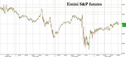 Global stocks, US futures, gold, the dollar and bitcoin all rose after the purge of Venezuela’s President Nicolas Maduro fanned geopolitical risk, while renewed momentum in the AI trade powered tech heavyweights in Asian hours. As of 8:15am ET, S&P futures were up 0.3% while Nasdaq futures gained 0.6%, with chip stocks such as AMD, Micron Technology and Intel gaining more than 3% in premarket trading. . In Europe, the Stoxx 600 rose 0.4% and was on course for a record close with most of the upside coming from a handful of sectors. Tech stocks are leading, as they did in Asia overnight. Spot gold advanced nearly 2% to climb above $4,410 an ounce, while silver jumped more than 3%. A gauge of the dollar headed for its biggest gain in two weeks. The US economic calendar includes December ISM manufacturing at 10am; ahead this week are S&P Global US services PMI, ADP employment change, ISM services index, JOLTS job openings, factory orders and December employment. No Fed speakers are scheduled for Monday; Richmond Fed’s Barkin is set to speak on the economic outlook on Tuesday.