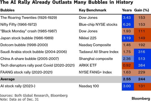 Meanwhile, AI remains the hot topic for equity traders this Monday. Nvidia partner Hon Hai’s quarterly sales beat estimates after global tech firms accelerated their build-out of data centers, TSMC jumped after Goldman analysts lifted their price target by 35% and a Chinese national investment fund raised its stake in SMIC. And while some investors are asking if the AI boom is a bubble waiting to pop, history suggests the answer isn’t easy to gauge as the following table from Bloomberg shows.