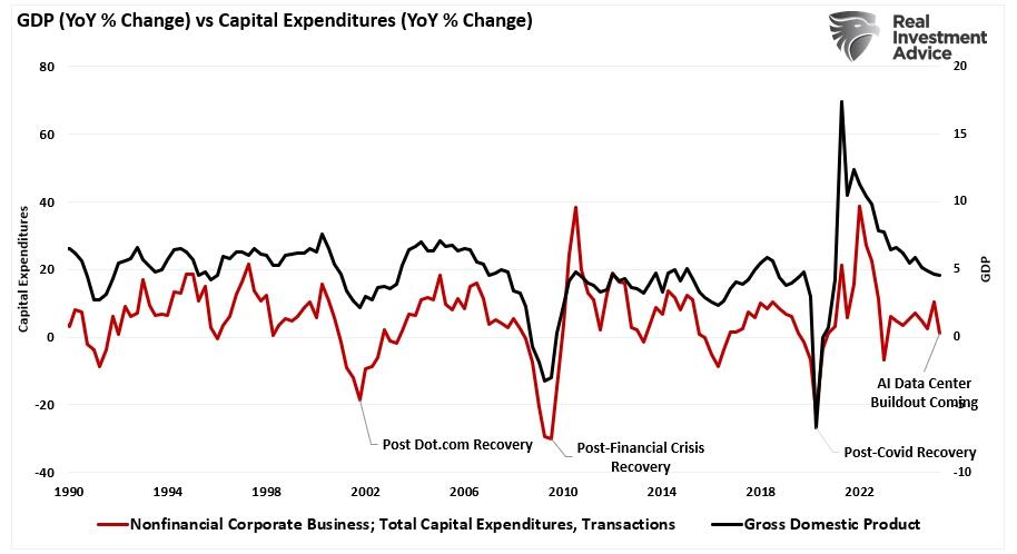 Read that last part again, because this is where Greg’s commentary hits home. Historically, capital expenditures tend to surge following recessions and economic downturns. This makes sense as companies expend capital to ramp up production as economic growth returns. You will notice a high correlation between economic and capital expenditures (CapEx) growth rates. Notably, this is particularly relevant in the AI sector, where firms are investing billions into chips, servers, and data centers, which will likely coincide with an increase in economic activity.