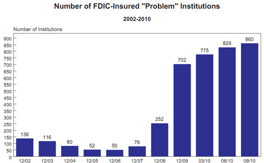 The number of institutions on the FDIC's "Problem List" rose from 860 to 884. Total assets of "problem" institutions increased to $390 billion from $379 billion in the prior quarter, but are below the $403 billion reported at year-end 2009. The rate of increase in the number of "problem" banks has declined in each of the past four quarters. Thirty insured institutions failed during the fourth quarter, bringing the total number of failures for the full year to 157.