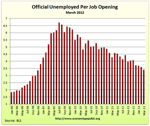 The BLS JOLTS, or Job Openings and Labor Turnover Survey reports a dismal and pathetic jobs market. The April 2012 statistics show there were 3.66 official unemployed persons for every position available*. There were 3,416,000 job openings for April 2012, a -8.69% change from the previous month of 3,741,000. Openings are still way below pre-recession levels of 4.7 million. Job openings have increased 56% from their July 2009 trough, yet opportunities are miles away from the 1.8 persons per job opening ratio at the start of the recession, December 2007. Below is the graph of April official unemployed, 12.5 million, per job opening.