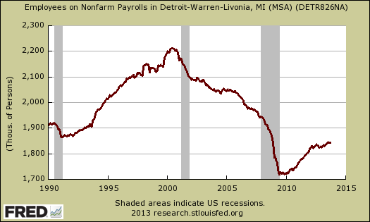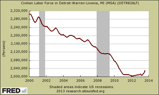Well, first the auto industry offshore outsourced jobs as well as moved to cheap labor states. Detroit has lost almost a million residents and from 2000 to 2012 and the people counted as either employed or unemployed has shrunk dramatically.