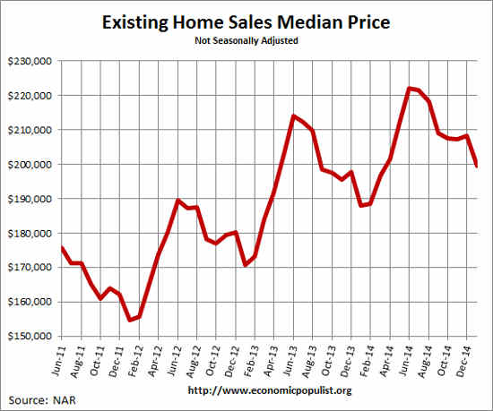 The national median existing home sales price, all types, is $199,600, a 6.2% increase from a year ago. This is the 35th month prices have increased and NAR uses the word soar to describe existing home prices. The average existing sales price for homes in January was $248,100, a 4.9% increase from a year ago. Below is a graph of the median price.