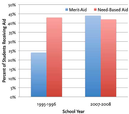 Below are graphs from the report. These figures show just how much funding for financial aid has changed. The first graph is financial aid based on income vs. merit in public universities and the second graph is the breakdown in financial aid from private institutions. Merit scholarships are almost mislabeled. These are scholarships for the best students, but this implies high school students, which does not a university graduate make. High schools are also not created equal in the eyes of University acceptance administrators, although the report does not delve into bias against high school graduates from low income areas. Additionally, if students must work while attending school it is almost guaranteed their grades will be lower due to less time available to devote to studies. Yet people who need financial aid the least are getting the most.